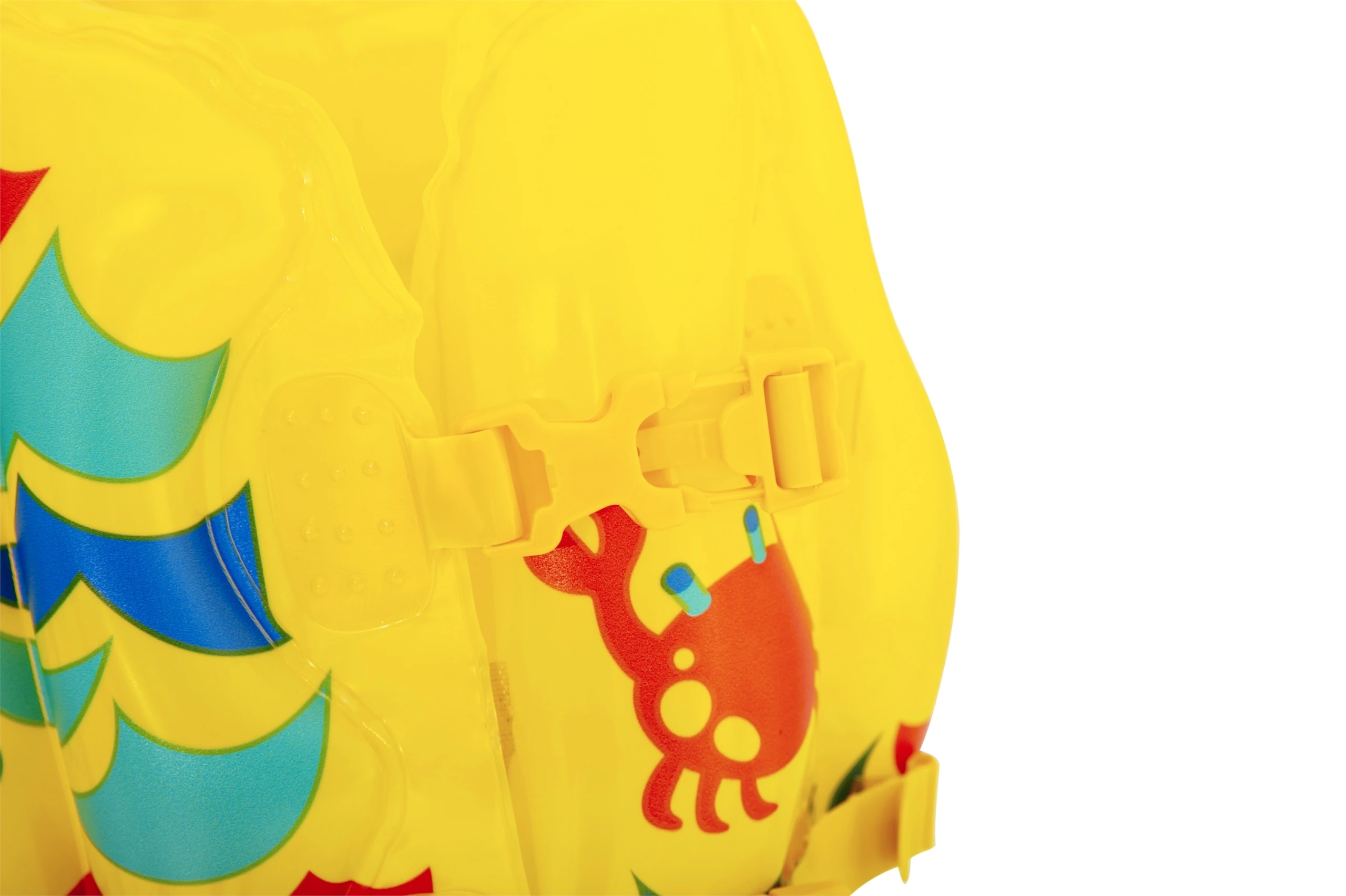 Kamizelka do nauki pływania 41 x 30 cm Rozpocznij lato i pozwól swojemu dziecku bezpiecznie korzystać z wody dzięki nadmuchiwanej kamizelce do pływania dla dzieci Bestway BermudaBay. Ta nadmuchiwana kamizelka do pływania jest idealna dla dzieci w wieku 3-6 lat. Zawiera 2 bezpieczne dla dzieci, regulowane klamry i 2 komory powietrzne zapewniające bezpieczeństwo i wyporność, dzięki czemu Twoje dziecko może bezpiecznie doświadczać wody, nawet jeśli nie jest jeszcze gotowe do samodzielnego pływania. Nadmuchiwaną kamizelkę Bestway BermudaBay wyposażono w jaskrawy, tropikalny nadruk, a jej napełnianie, opróżnianie i przechowywanie nie wymaga wysiłku. Z tą pomocną kamizelką każdy dzień na basenie będzie przypominał tropikalne wakacje!