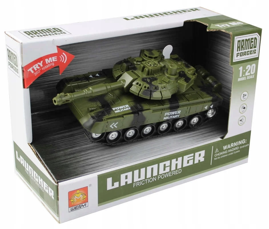 Czołg na baterie, z kółeczkami od spodu, sam jeździ i zmienia kierunek jazdy, gdy zbliża się do przeszkody. Po nałożeniu specjalnej nakładki na kółeczka dziecko może samodzielnie pchać pojazd i jeździć nim po podłodze. Niewielki gabaryt idealnie dopasowuje się do dziecięcych rączek. Czołg podczas jazdy wydaje realistyczne dźwięki strzałów, a zamontowane diody mienią się kolorowym światłem.