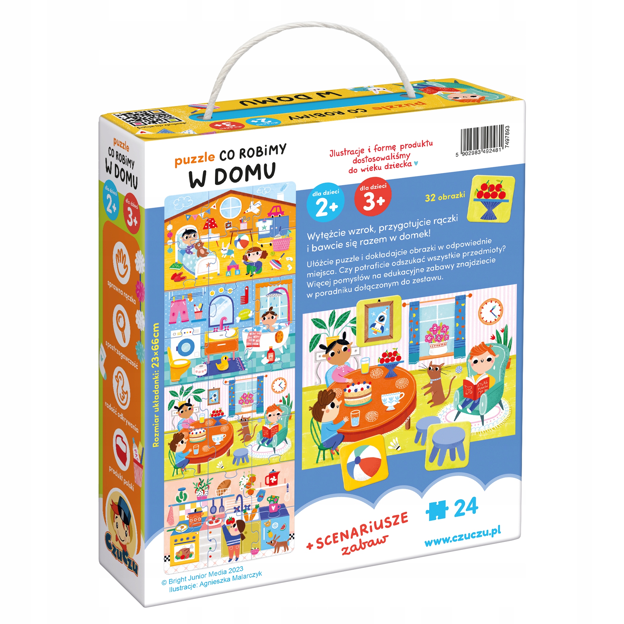 Puzzle Co robimy w domu od polskiej marki CzuCzu to pełna detali układanka, która zaprasza dzieci do poznawania znanych im rytuałów i czynności. Zestaw składa się z 24 dużych elementów, które po złożeniu tworzą barwną ilustrację przedstawiającą przekrój domu i jego mieszkańców podczas zabawy, nauki i odpoczynku. To doskonały punkt wyjścia do rozmów o codziennym planie dnia, obowiązkach i wspólnej zabawie, co pomaga maluchom lepiej zrozumieć otaczający je świat.