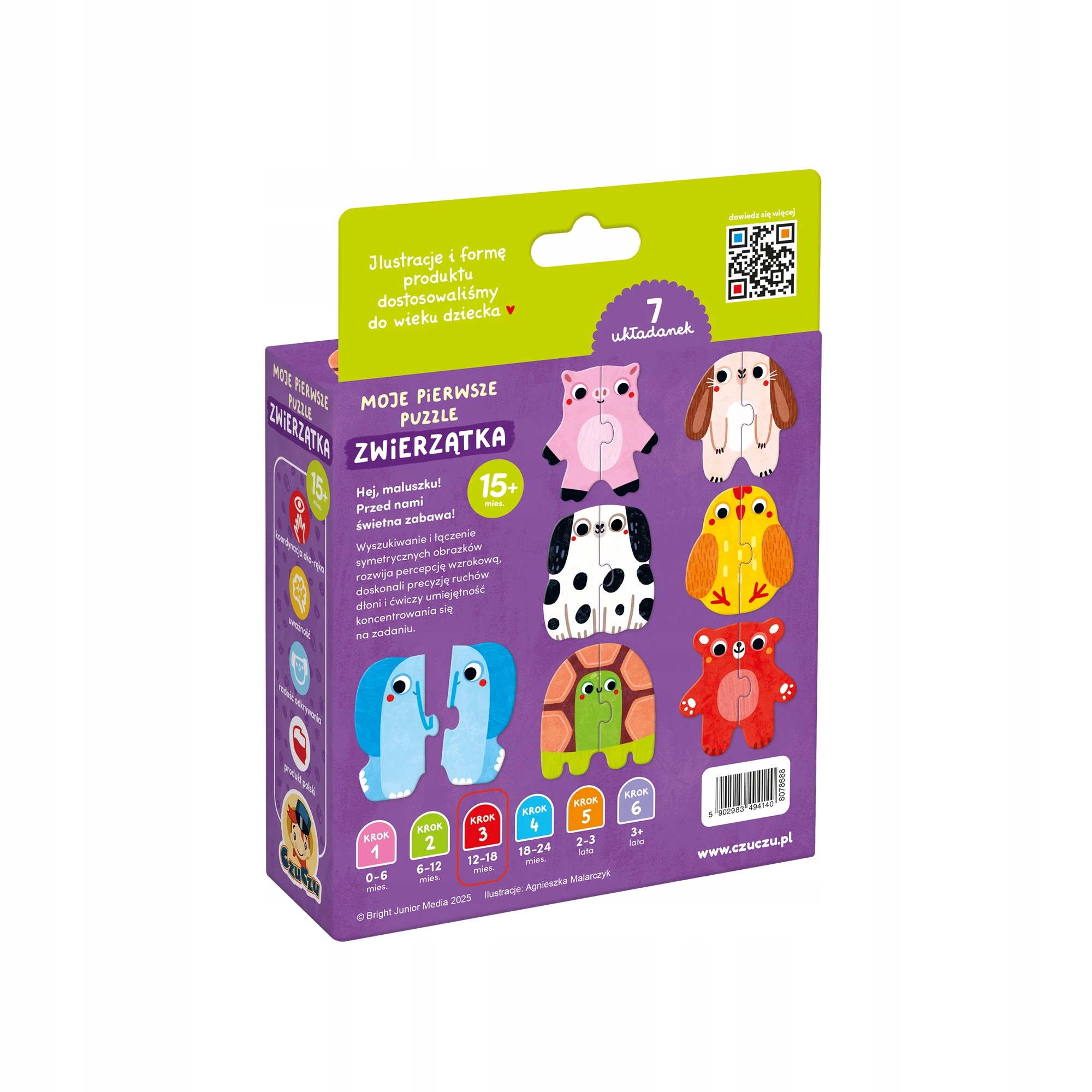 Puzzle Zwierzątka od polskiej marki CzuCzu to zestaw stworzony specjalnie dla dzieci powyżej 15. miesiąca życia. Komplet składa się z 14 dużych elementów, z których można ułożyć 7 oddzielnych, dwuelementowych układanek przedstawiających przyjazne zwierzaki. Dzięki prostym kształtom i wyraźnym ilustracjom maluch uczy się kojarzenia faktów, rozpoznawania gatunków oraz precyzyjnego dopasowywania klocków. To doskonały sposób na rozpoczęcie przygody z tradycyjnymi puzzlami w bezpiecznej i dopasowanej do możliwości dziecka formie.