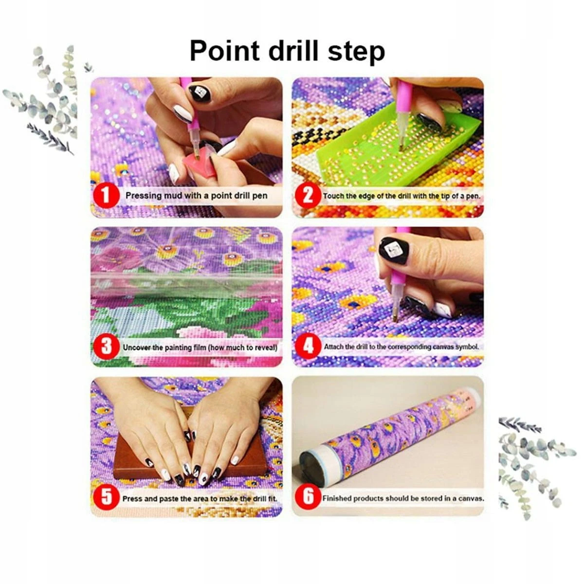 2. Płótno pokryte jest warstwą kleju, który umożliwia przyklejanie diamencików. Pamiętaj aby odklejać folię ochronną tylko z tego fragmentu płótna który będziesz wypełniać diamencikami. Folię odklejaj stopniowo wraz z kolejnych elementów dzięki czemu unikniesz wyschnięcia kleju na pozostałej części płótna.