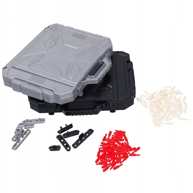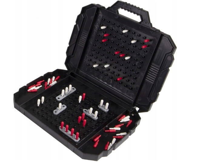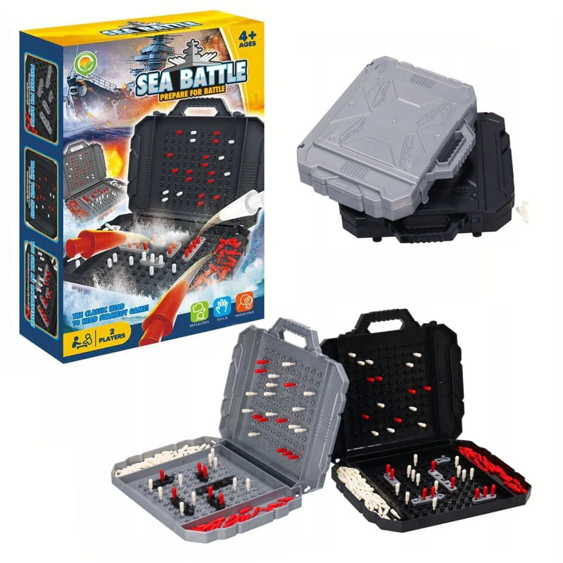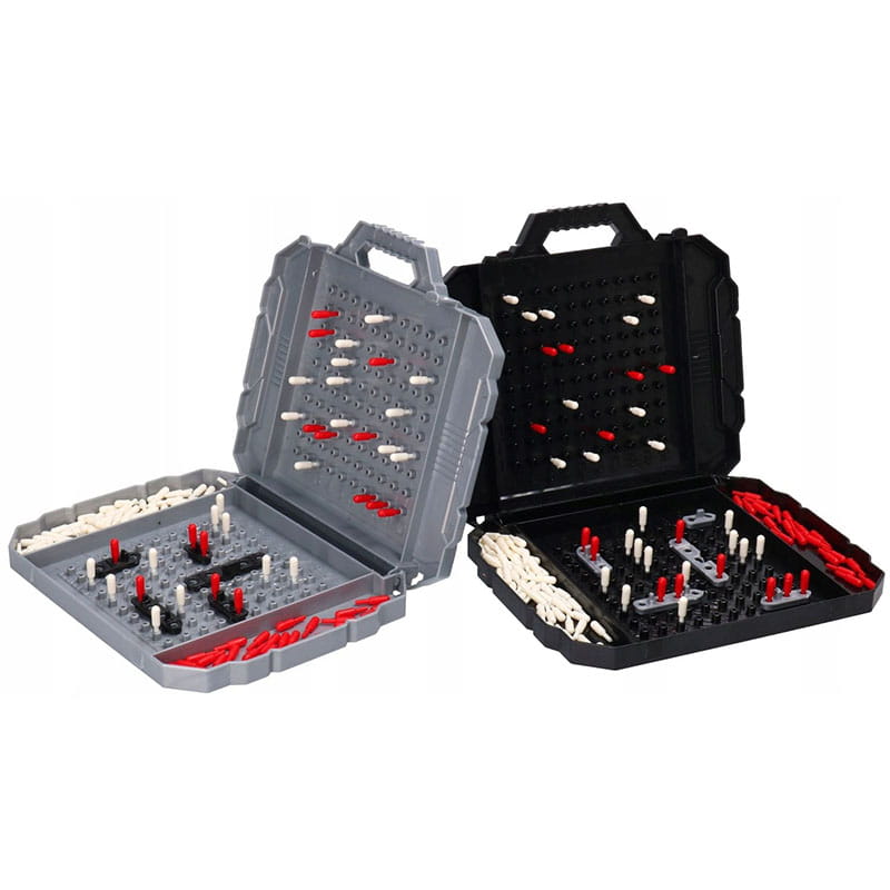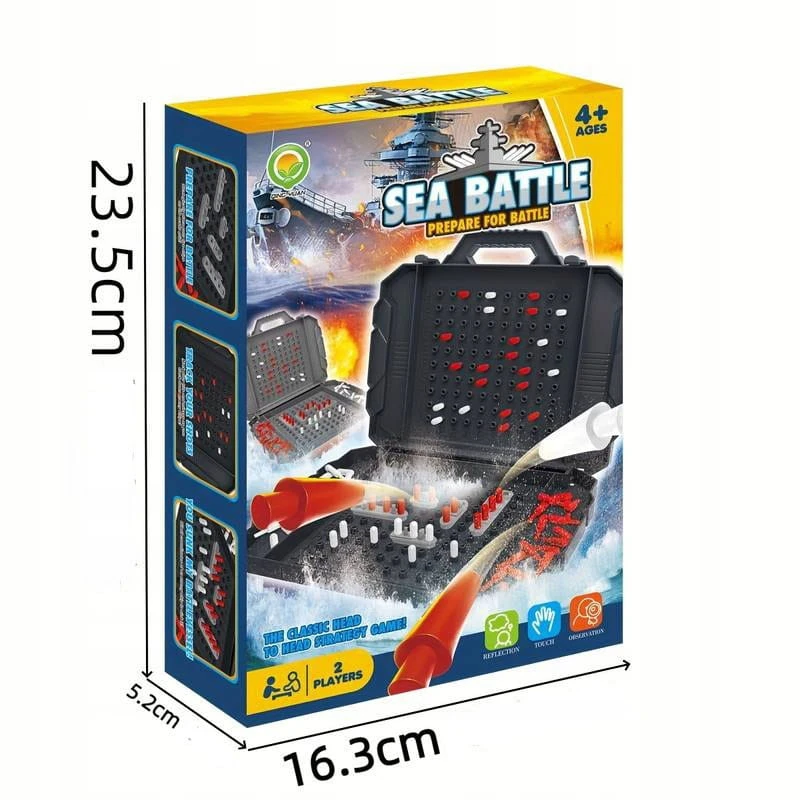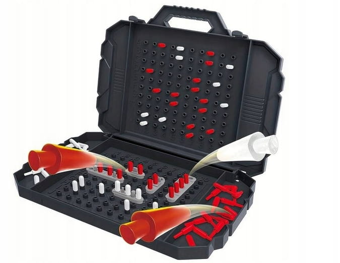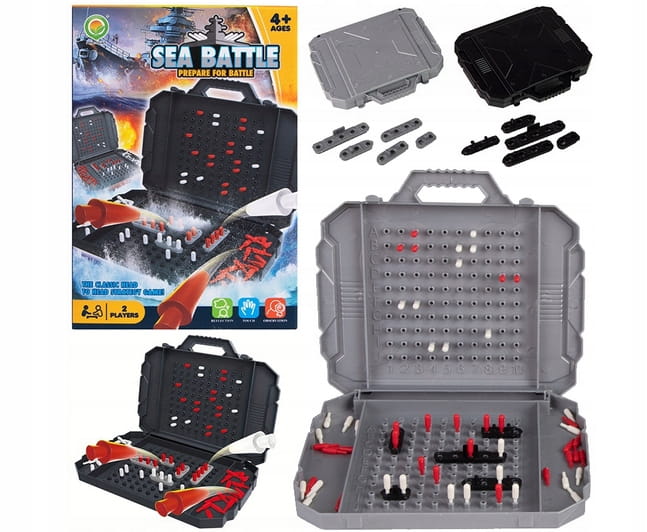 Wewnątrz opakowania znajdziesz 2 rozkładane plastikowe plansze, zestaw okrętów, zestaw czerwonych i białych kołeczków. Dzięki temu kompletnemu zestawowi będziesz gotowy do podjęcia strategicznych bitew morskich.