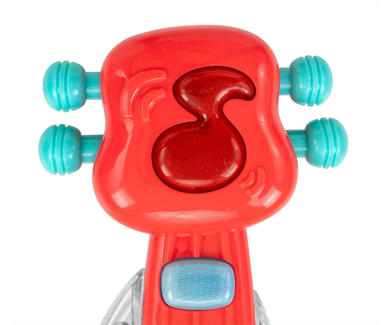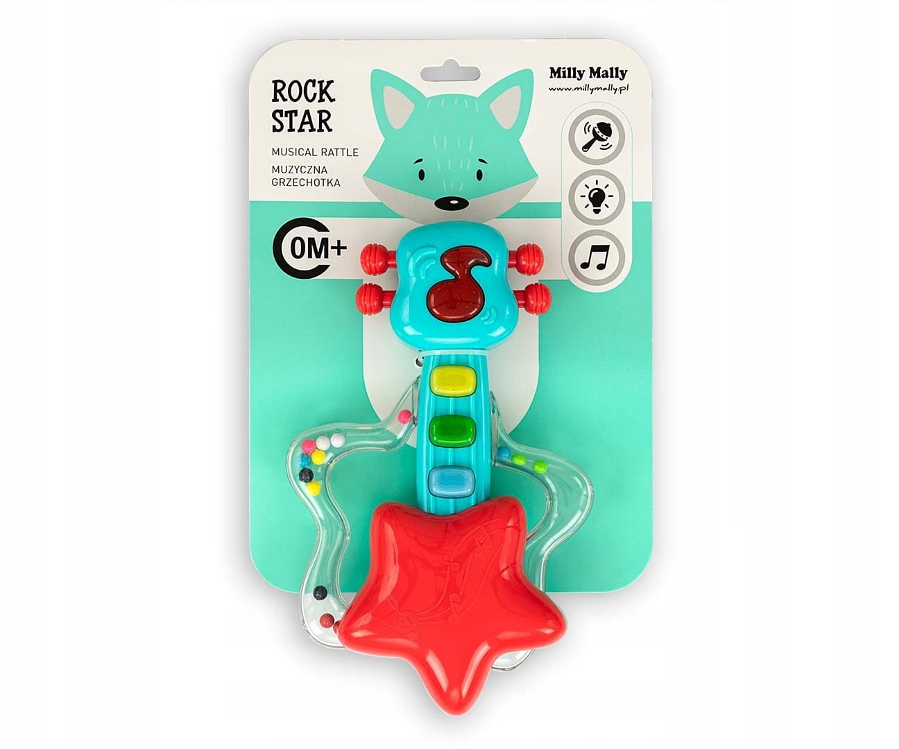 Prezentujemy muzyczną gitarę, która wygrywa 6 ekscytujących melodii oraz posiada efekty świetlne. Naciskając przycisk w kształcie nutki, znajdujący się na górze, można zmienić tryby z muzycznego na tryb instrumentu. Nasza gitara posiada łatwy do złapania przez dziecko uchwyt, jest on przeźroczysty aby dziecko mogło zainteresować się umieszczonymi w środku kolorowymi kółeczkami, które przy każdym ruchu przemieszczają się, może służyć jako grzechotka. Każdy element gitary by Milly Mally jest przemyślany i zaprojektowany aby wesprzeć prawidłowy rozwój dzieci. Na gryfie gitary umieszczone są 3 przyciski muzyczne, które mają kształtować ciekawość dziecka . Jest to zabawka- grzechotka stymulująca jego zmysły co jest ważne w początkowym etapie rozwoju dziecka. Dziecko posługując się tą zabawką dostaje bodźce, pobudzona jest motoryka mała, czyli rozwija kontrolowane i precyzyjne ruchy łącznie z mimiką twarzy, rozwija się u niemowlaka wrażliwość na dźwięki. Kolejną cenną zaletą jest koordynacja wzrokowo-ruchowa zabawka pomaga dzieciom w kształtowaniu silniejszego poczucia własnej wartości, a to zwiększa ich samoocenę.