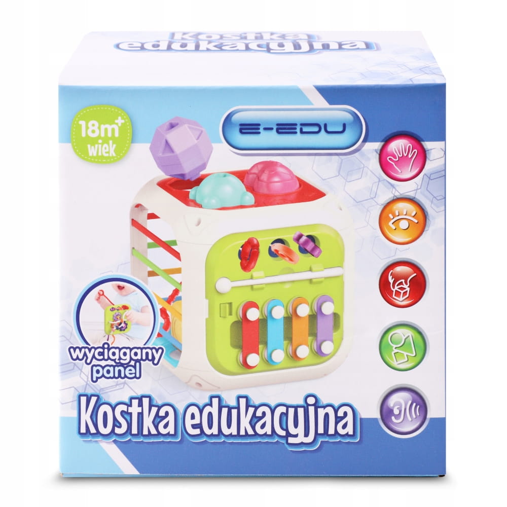 KOSTKA EDUKACYJNA Z CYMBAŁKAMI SORTER KLOCKI PANEL E-EDU +18m