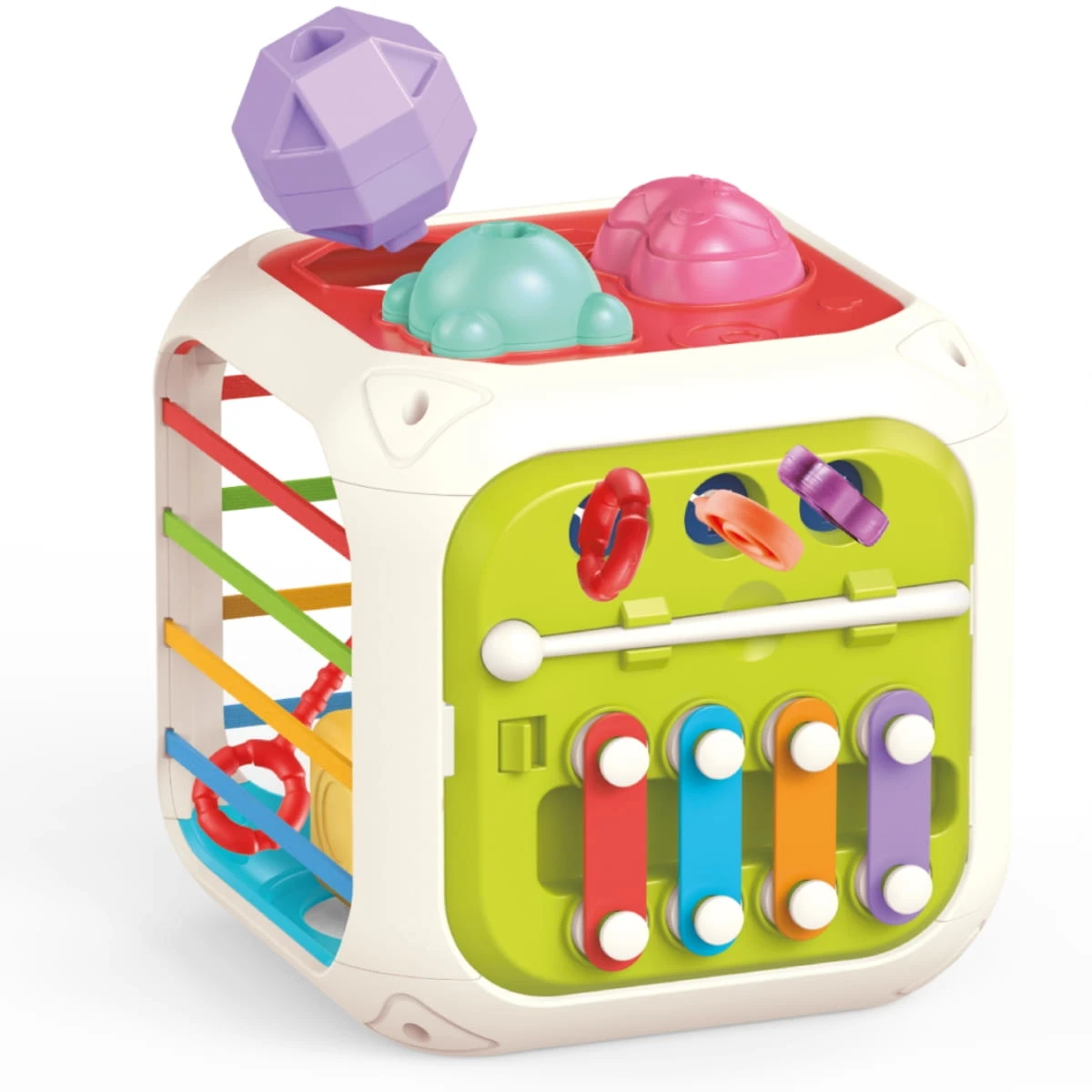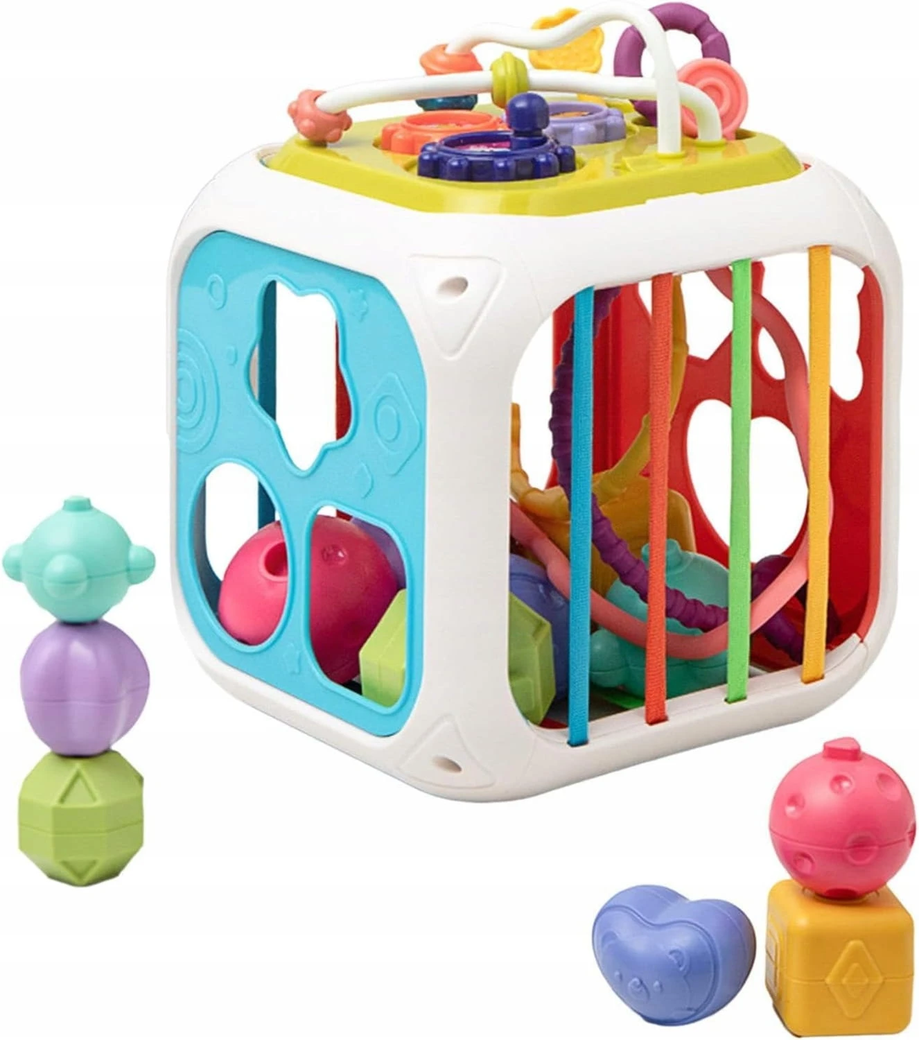 Kostka sorter dla niemowląt posiada różne zabawy rozwijające, takie jak: silikonowe linki do ciągnięcia, labirynt pereł, ksylofon dziecięcy, sortownik kształtów, obracające się koła zębate oraz pasujące piłeczki do układania piramidy.