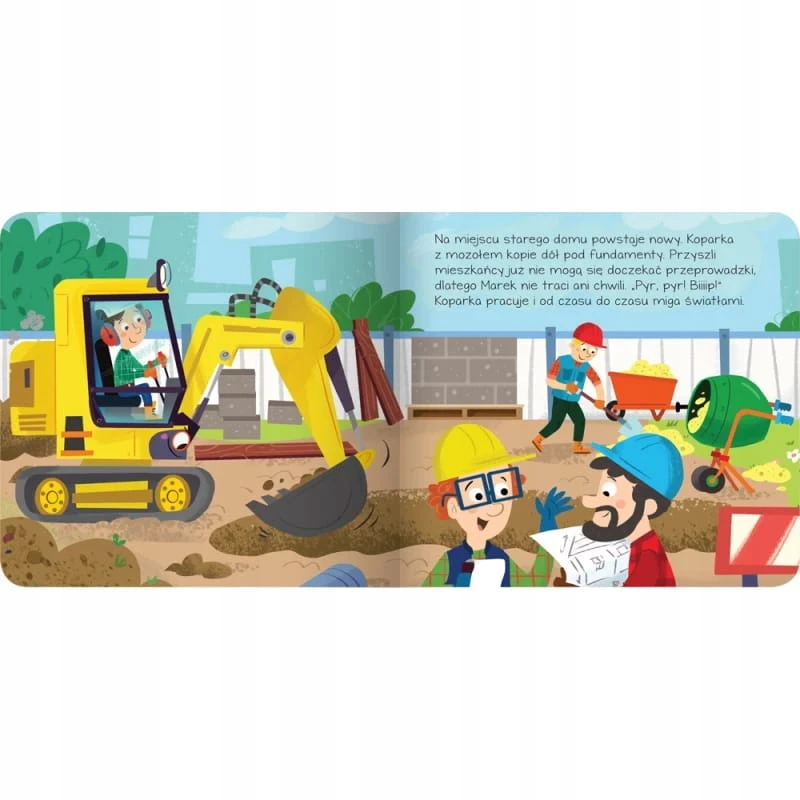 - Tematyka: Budzi podziw i zainteresowanie koparkami i pracami budowlanymi.