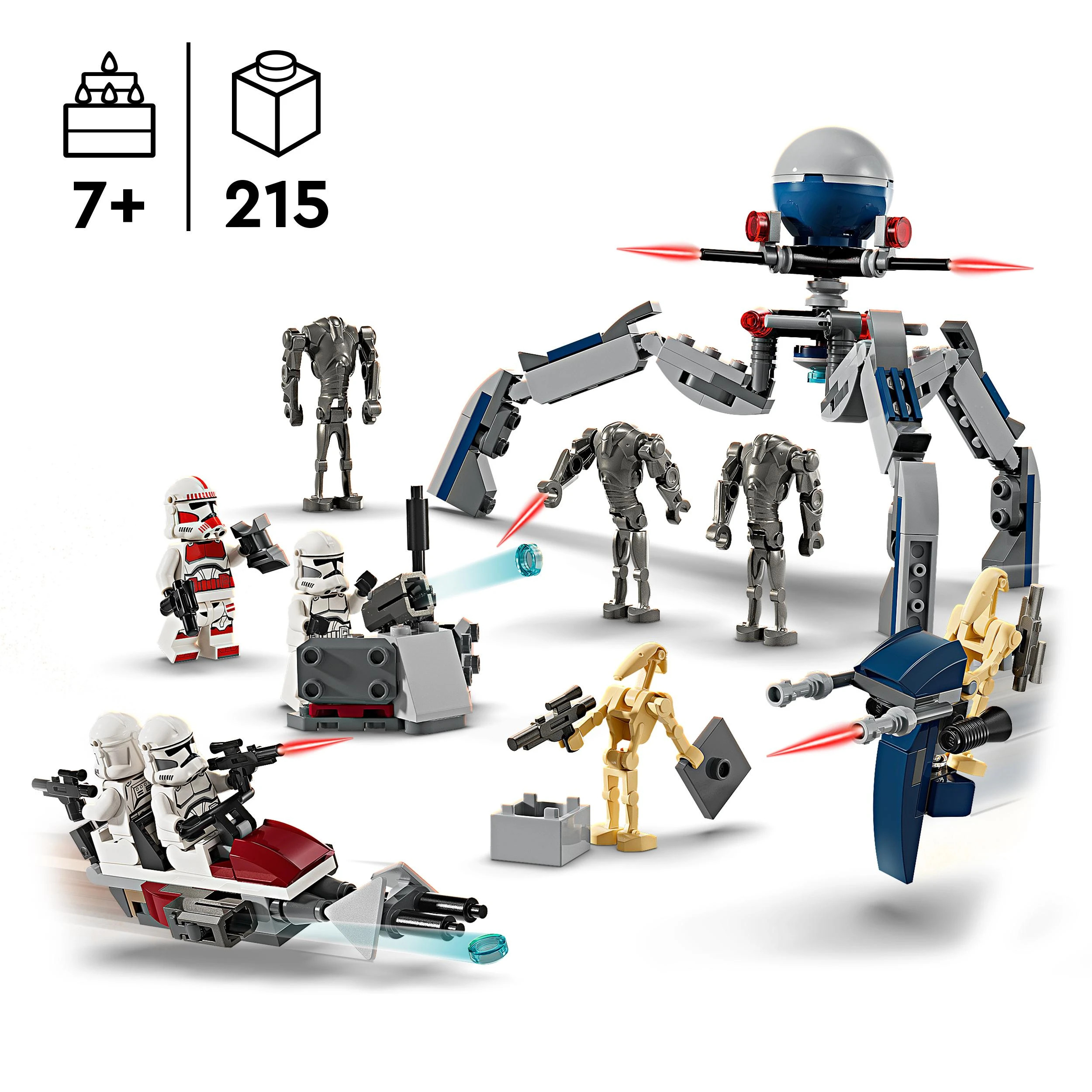 Zestaw LEGO Star Wars Zestaw bitewny z żołnierzem armii klonów i droidem (75372) to dynamiczna propozycja z katalogu 2024, która składa się z 215 elementów. Komplet ten jest idealny do budowania armii, ponieważ zawiera aż 4 minifigurki LEGO Star Wars oraz 5 figurek droidów (w tym superdroida bojowego i droidy bojowe). W zestawie znajduje się również śmigacz klonów z wyrzutnią klocków oraz tri-droid z ruchomymi elementami. W zestawie otrzymujesz również estetyczną torbę prezentową, co czyni ten produkt gotowym i wymarzonym upominkiem dla każdego fana odległej galaktyki.