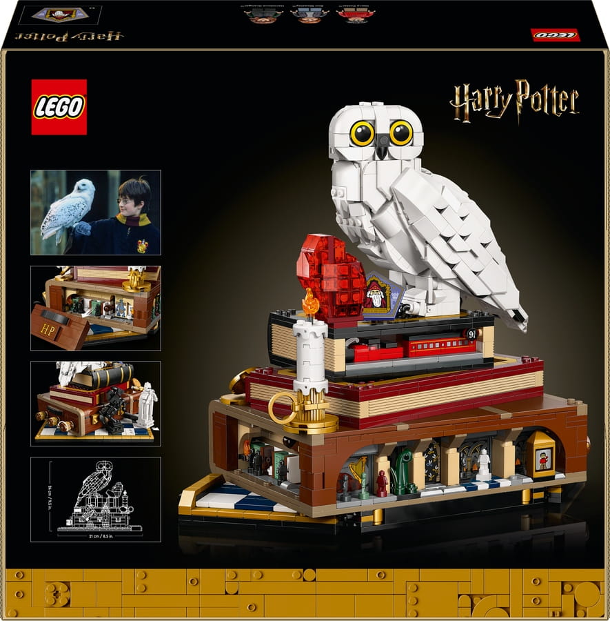 Zbuduj pierwszą Hedwigę LEGO, śnieżną sowę ze złożonymi skrzydłami, i umieść ją obok Kamienia Filozoficznego oraz na walizce Harry'ego Pottera. Dodaj trzy minifigurki LEGO Harry Potter – Harry'ego Pottera, Hermiony Granger i Rona Weasleya – oraz szereg przedmiotów, w tym czekoladową żabę i czarodziejskie szachy.