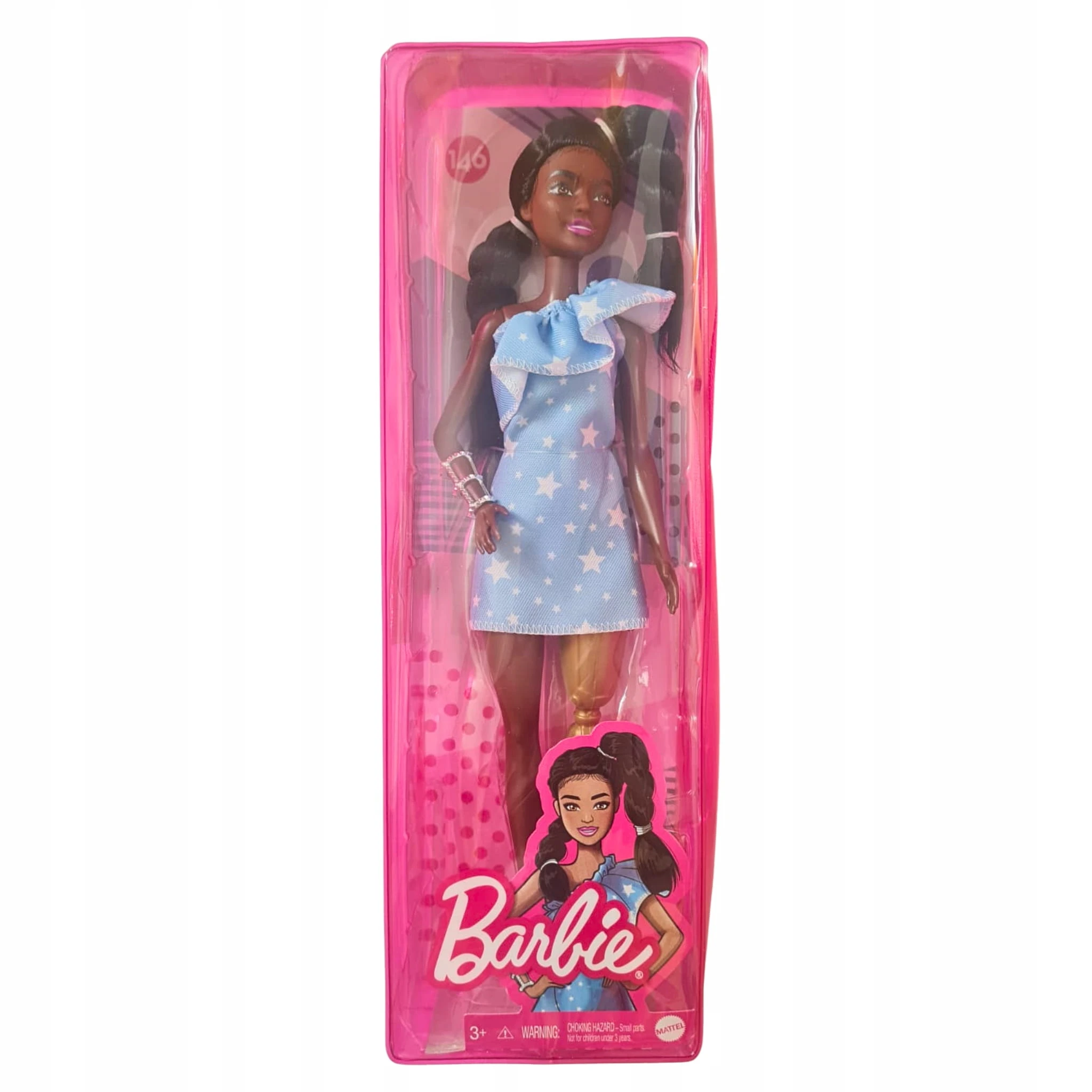 Lalka Barbie Fashionistas w modnym wydaniu - ma na sobie niebieską sukienkę w gwiazdki.