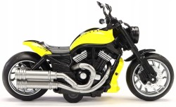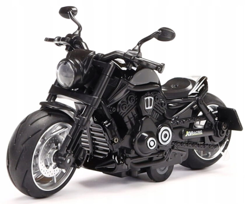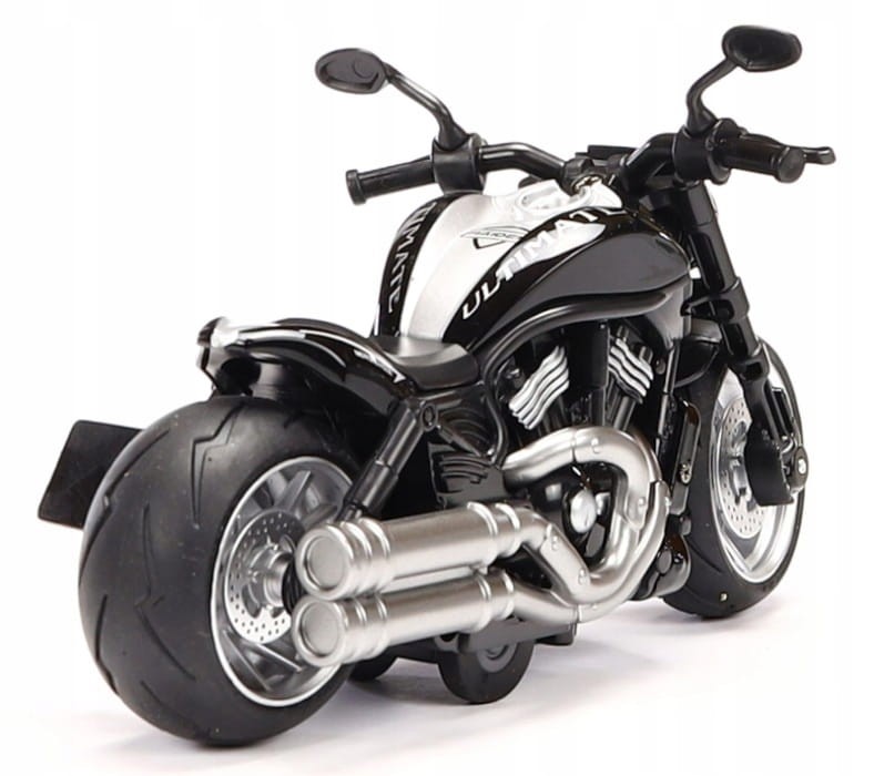 Motocykl napędzanych poprzez mechanizm ( Pull-back naciągnij do tyłu zabawkę i puść ). Stabilną jazdę zapewniają szerokie opony. Manetki i lusterka wykonane są z miękkiego tworzywa.