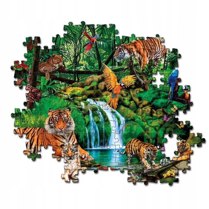 Puzzle składające się z 300 elementów to prawdziwe wyzwanie dla każdego małego miłośnika układania. Wysokiej jakości puzzle odznaczają się żywymi, przyciągającymi uwagę dziecka barwami, które uzyskano dzięki wykorzystaniu technologii Super Kolor. Po ułożeniu układanki powstanie obrazek o wymiarach 48,5x33,5cm, przedstawiający odosobnienie w dżungli. Układanie puzzli to rozwijająca aktywność, która wycisza i ćwiczy koncentrację dziecka. Ponadto uczy najmłodszych spostrzegawczości oraz rozwija ich zdolności manualne i umiejętność logicznego myślenia. Z każdym kolejnym puzzlem dopasowanym do układanki zaczynamy dostrzegać powstający obrazek, co sprawia ogromną satysfakcję. Puzzle zapewnią dziecku wiele godzin wspaniałej zabawy w układanie i będą doskonałym prezentem z okazji urodzin, Dnia Dziecka lub świąt. Wszystkie elementy układanki zostały umieszczone w solidnym, tekturowym pudełku.