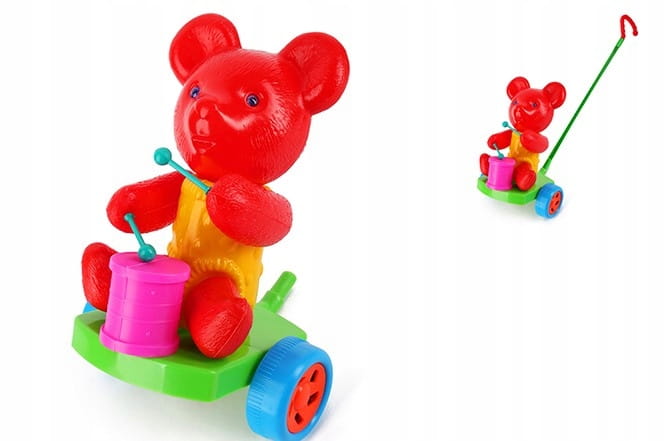 ✅MIŚ Z BĘBENKIEM to zabawka do pchania wykonana z atestowanego i bezpiecznego dla dziecka tworzywa oraz w ciekawej i atrakcyjnej kolorystyce.