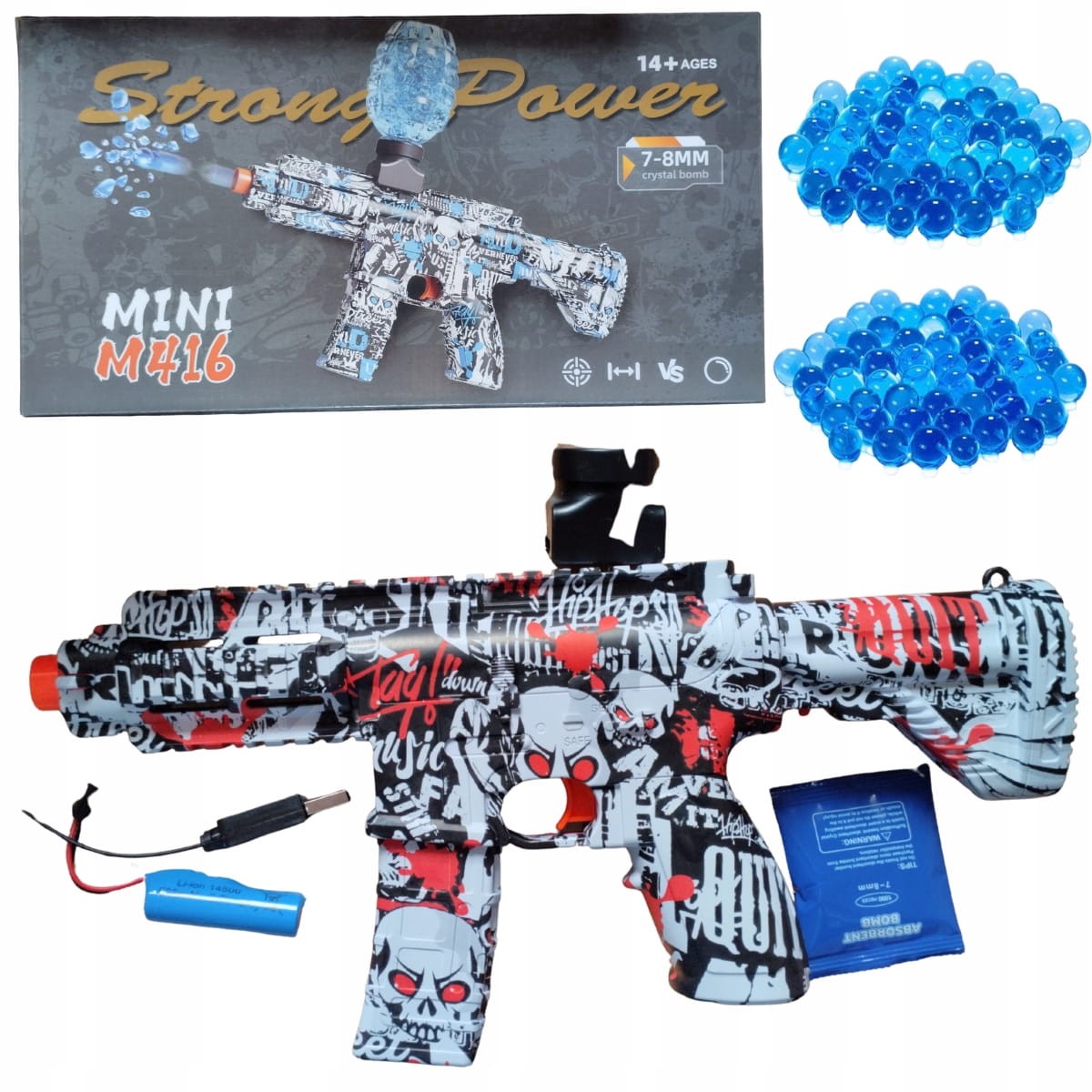 - W zestawie: karabin, kulki żelowe 7–8 mm, akumulator i kabel USB