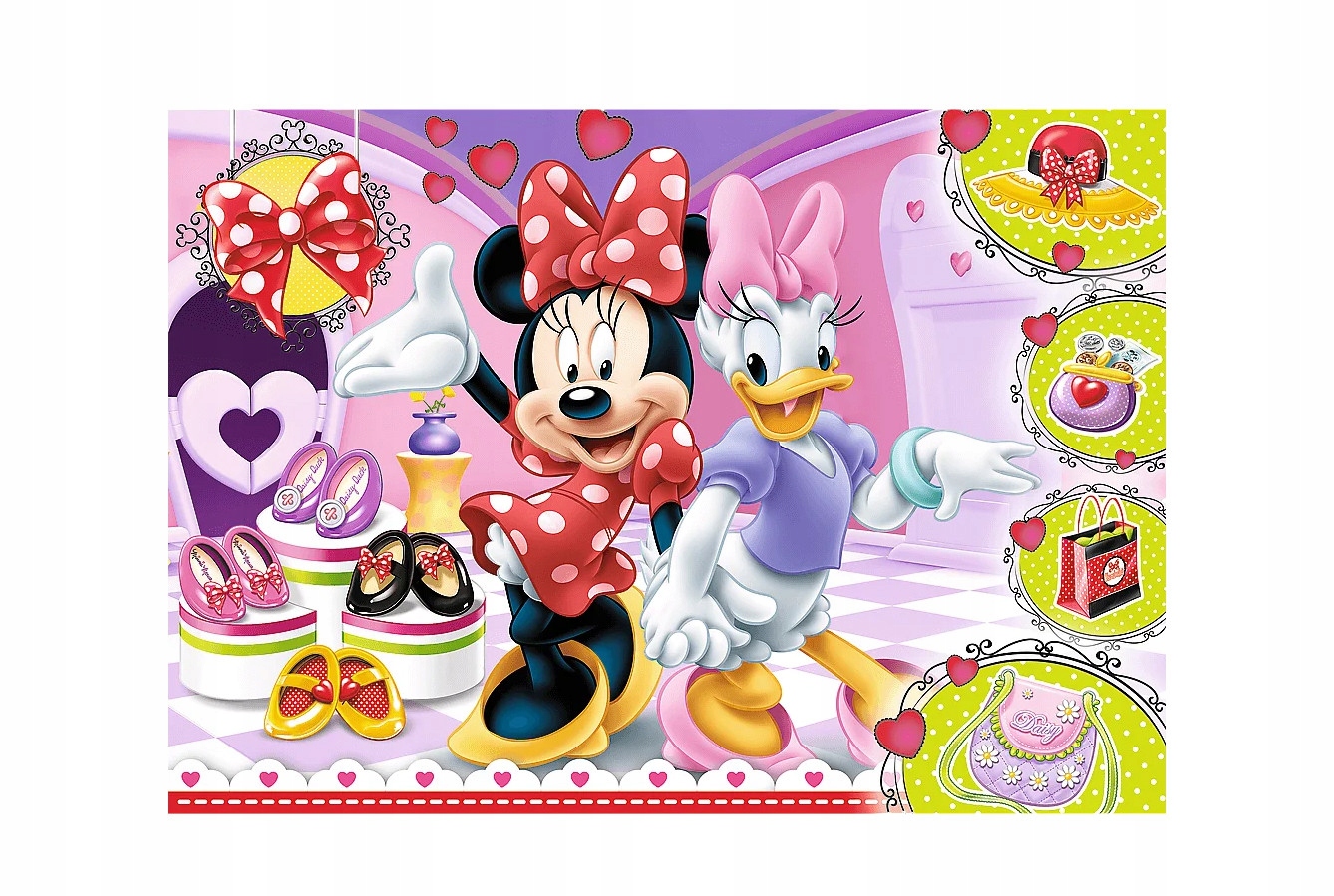 Minnie i błyskotki to puzzle składające się z 100 elementów, zaprojektowane specjalnie z myślą o małych fanach Myszki Minnie. Układanka została pokryta delikatnym, złotym brokatem, który sprawia, że zarówno opakowanie, jak i poszczególne elementy pięknie się mienią i sprawiają niesamowite wrażenie. Po ułożeniu puzzli powstanie obrazek o wymiarach 410x278 mm.