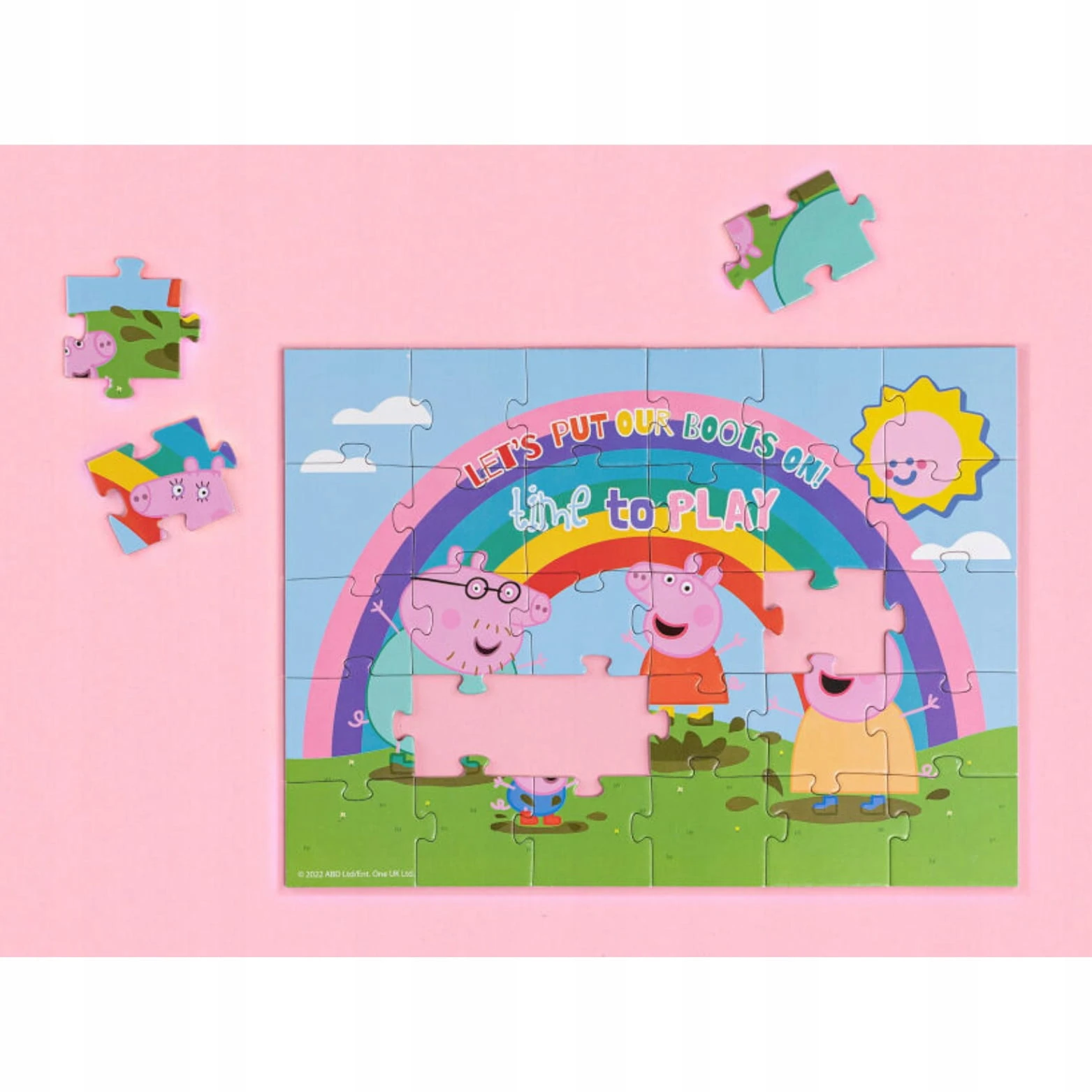 Barwne puzzle z popularnymi bohaterami bajki Świnka Peppa (Peppa Pig). Zestaw składa się z 30 elementów, idealnych dla małych rączek i stanowiących odpowiednie wyzwanie dla dzieci rozpoczynających przygodę z układaniem.