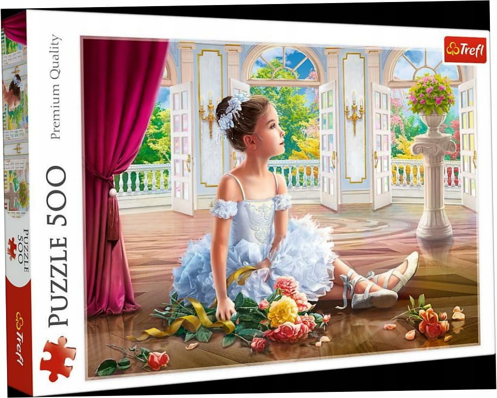 Puzzle tematyczne "Mała baletnica" firmy Trefl, składające się z 500 elementów. Układanka przedstawia uroczą baletnicę siedzącą na parkiecie pośród kwiatów. Idealne dla miłośników baletu, tańca i romantycznych motywów.