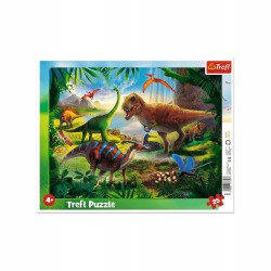 Puzzle ramkowe "Dinozaury" firmy Trefl, składające się z 25 elementów. Kolorowy obrazek przedstawia różnorodne dinozaury w naturalnym środowisku, z pewnością zachęcając dzieci do układania.