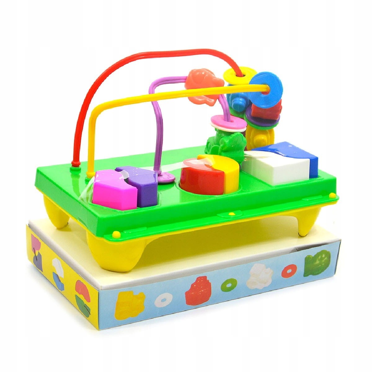 ✅W stoliku znajdują się umocowane na stałe plastikowe pałąki, powyginane tak aby utrudnić przesuwanie umieszczonych na nich – bajecznie kolorowych i pięknych kształtem figurek, np.: lokomotywa, samolot, statek, kolorowe obręcze.