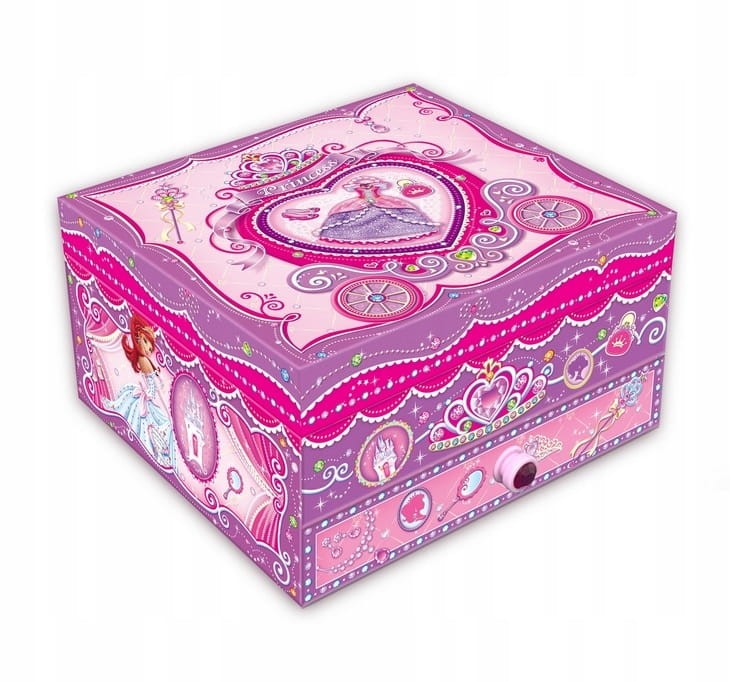 Szkatułka z pozytywką i szufladką (model 136RS). Idealne miejsce na skarby małej damy, utrzymane w bajkowej stylistyce Księżniczki. Posiada główną komorę, a także wysuwaną szufladkę dla dodatkowych drobiazgów. Po otwarciu gra melodię, a wewnątrz obraca się figurka baletnicy.