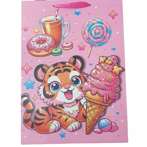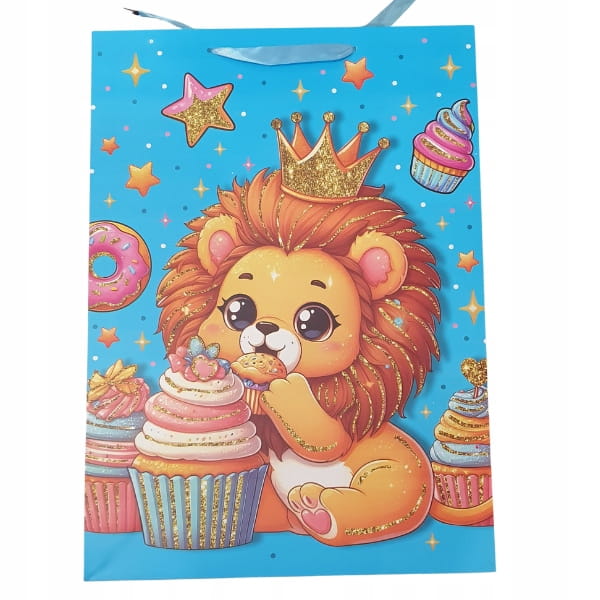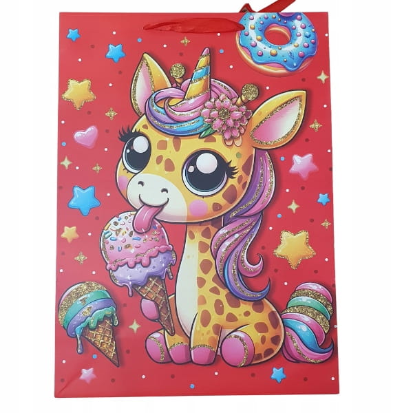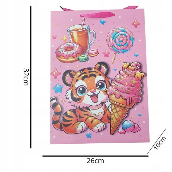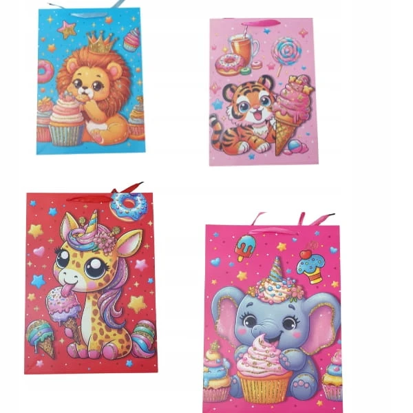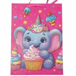 Papierowa torba prezentowa o wymiarach 32x26x10 cm z szerokim dnem – praktyczna do pakowania małych i średnich prezentów, mieszcząca format A4. Torby ozdobione są kolorowymi, dziecięcymi motywami, które sprawiają, że każdy upominek wygląda wyjątkowo.