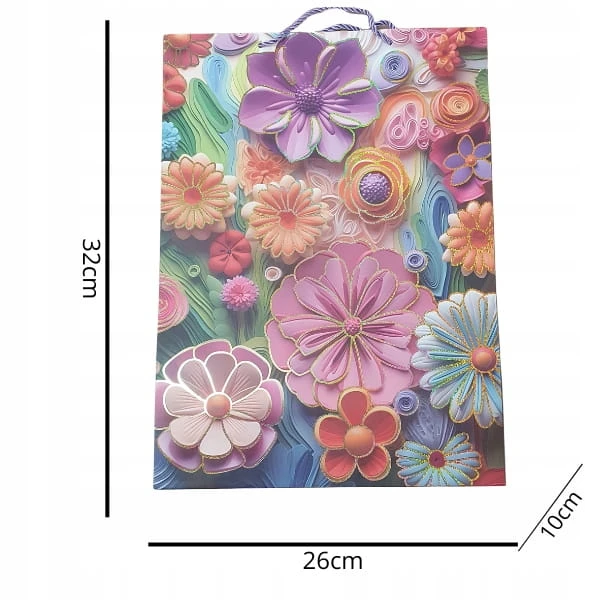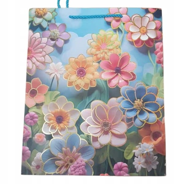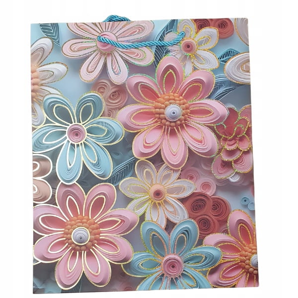 Elegancka torba papierowa o wymiarach 40x30x12 cm z szerokim dnem – idealna do pakowania prezentów, książek czy dokumentów w formacie A4. Kwiatowe motywy nadają jej delikatny i stylowy wygląd, doskonały na każdą okazję – urodziny, ślub, Dzień Matki czy imieniny.