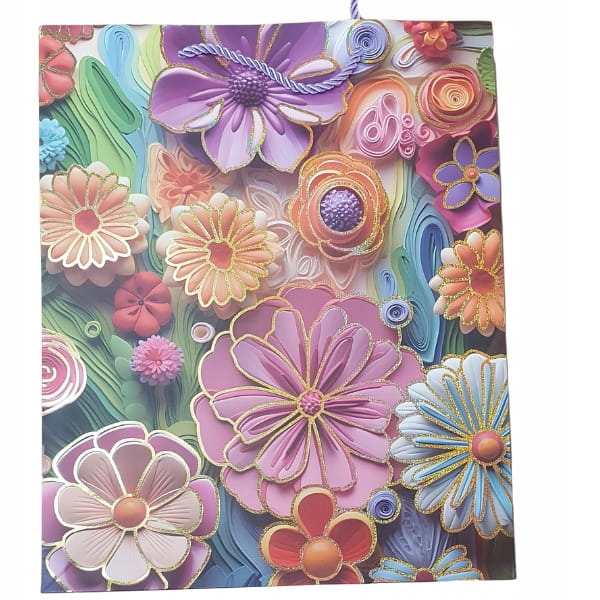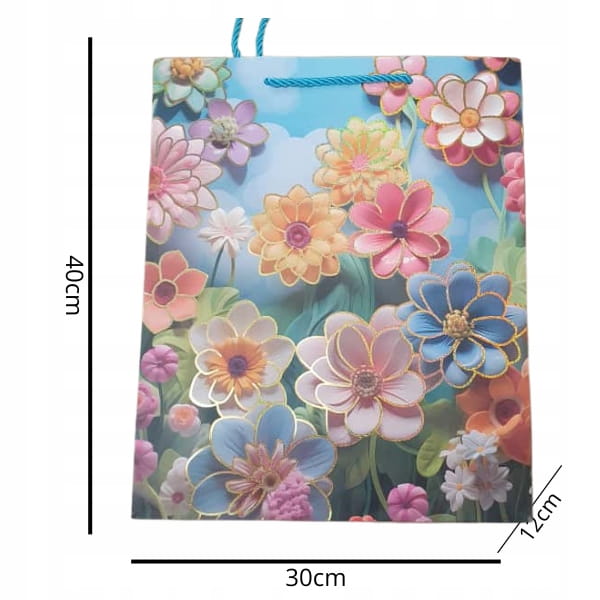 Elegancka torba papierowa o wymiarach 40x30x12 cm z szerokim dnem – idealna do pakowania prezentów, upominków i drobiazgów. Kwiatowe motywy nadają jej delikatny i stylowy wygląd, dzięki czemu doskonale sprawdzi się na każdą okazję – urodziny, ślub, Dzień Matki czy imieniny.