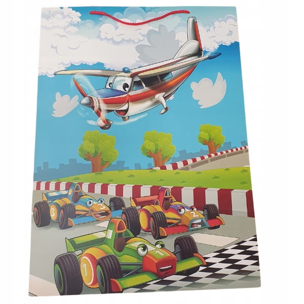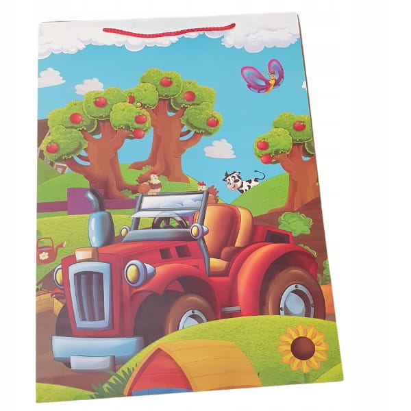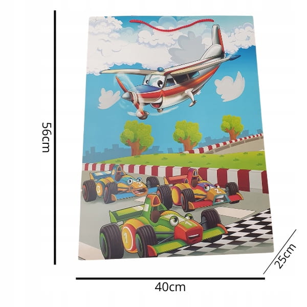 Duża papierowa torba prezentowa o wymiarach 56x40x25 cm z szerokim dnem – idealna do pakowania większych upominków. Torby ozdobione są kolorowymi, dziecięcymi motywami, które sprawiają, że każdy prezent wygląda wyjątkowo.