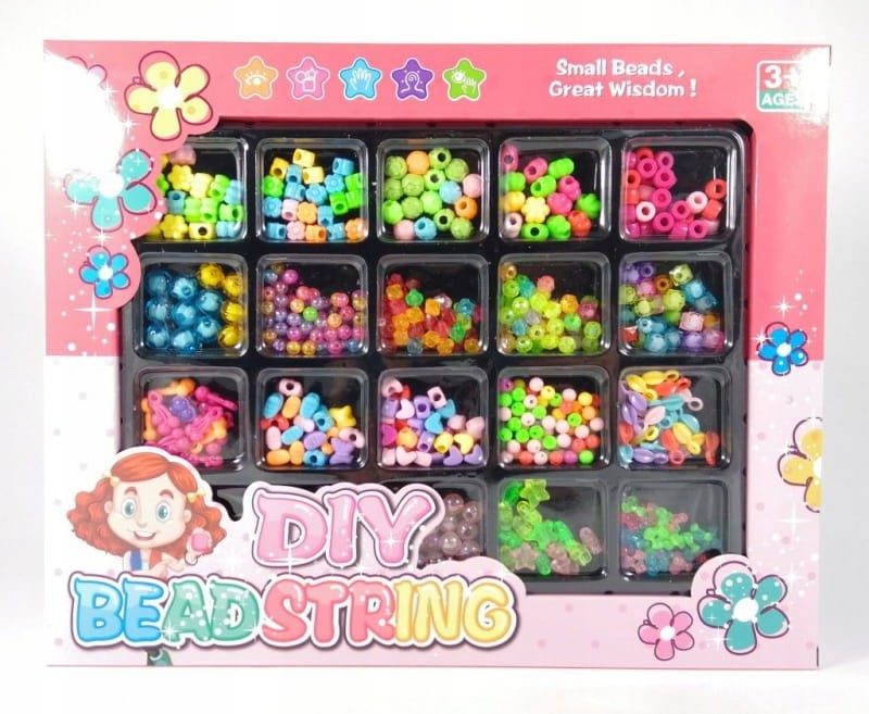 - Zestaw kolorowych koralików spodoba się każdej małej modnisi. Tworzenie z nich różnych bransoletek lub innej biżuterii, zapewni godziny kreatywnej zabawy