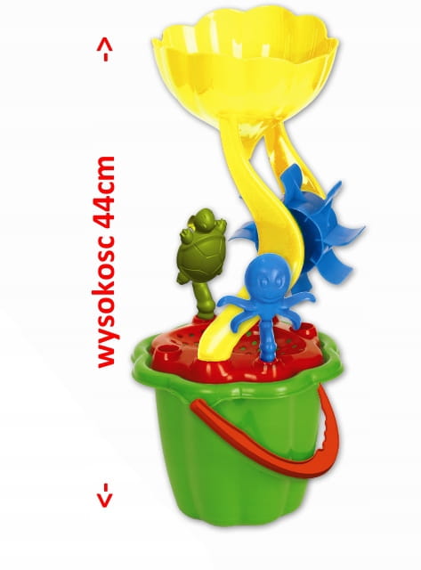 Bardzo bogaty zestaw do piasku składający się z 6 elementów: młynka do piasku, wiaderka, 2 foremek w kształcie zwierzątek morskich oraz grabek i łopatki. Produkt wykonany jest z trwałych i bezpiecznych surowców, dzięki czemu odporny jest zarówno na warunki atmosferyczne jak i jest bezpieczny dla dzieci.