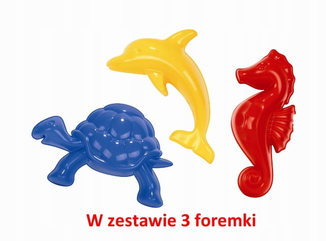 Zestaw składa się z 3 foremek do piasku przypominające swoim wyglądem zwierzątka morskie: delfina, żółwia, konika morskiego. Idealne do zabawy w lato, zarówno na plaży jak i w przydomowej piaskownicy.
