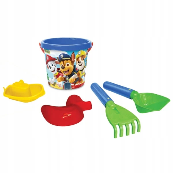 Komplet letni sprawdzi się podczas wakacji nad morzem lub jeziorem oraz w piaskownicy. Zestaw składa się z: wiaderka, łopatki, grabek, foremki i łódki. Barwna i atrakcyjna grafika z wizerunkami bohaterów Psiego Patrolu, która została zamieszczona na wiaderku wykonana jest w technologii IML co znaczy, że jest trwale wtopiona w tworzywo, zatem nie ma ryzyka, że się zniszczy lub odklei.